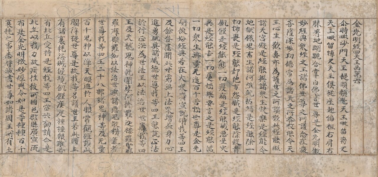The "Konkomyōkyō Kandai Ni" (Second Scroll of the Golden Light Sutra), a beautifully copied sutra, was written in 1192 as a memorial offering for Emperor Go-Shirakawa upon his death. It is believed that the paper used for this sutra was repurposed from an illustrated scroll that the emperor had been involved in creating during his lifetime, and beneath the sutra text are illustrations that appear to be narrative drawings [preliminary sketches before coloring]. It was designated a National Treasure in 2025.