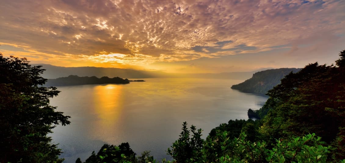 El lago Towada es un lago de doble caldera formado por la actividad volcánica y está rodeado por montañas en el borde exterior, como el monte Ohanabe y el monte Towada.