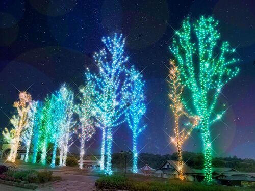 毎年好評いただいている、15m以上の高さを誇るメタセコイアのイルミネーションをはじめ、シャンパンゴールドに輝く吊り橋、傾斜を利用したエリアなど、地形や樹木を活用した演出のほか、カピバラや羊など園内の動物をモチーフにした牧場エリアなどハーベストの丘らしさをコンセプトにデザイン。