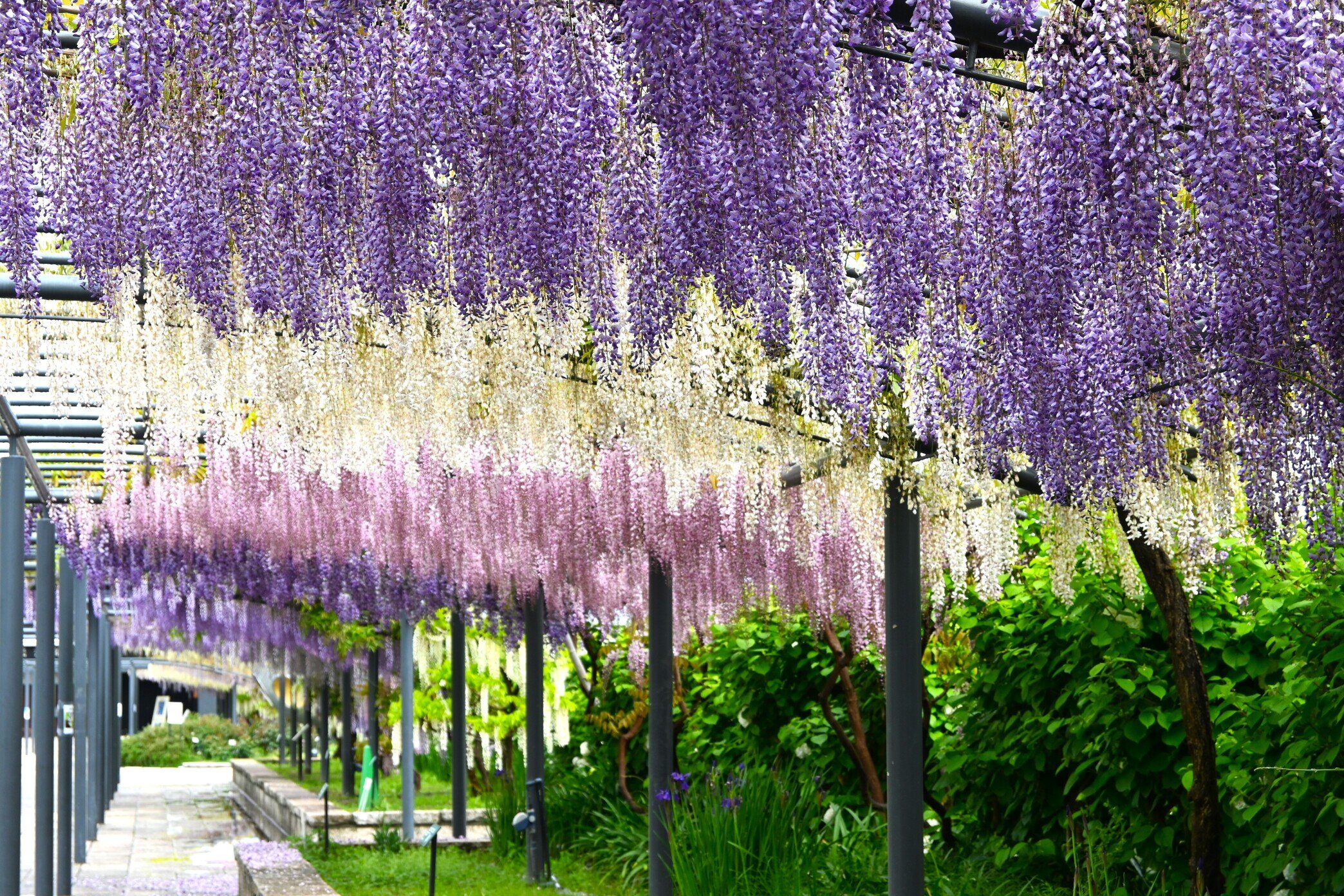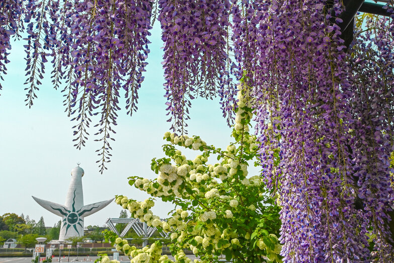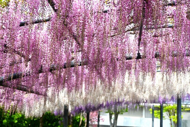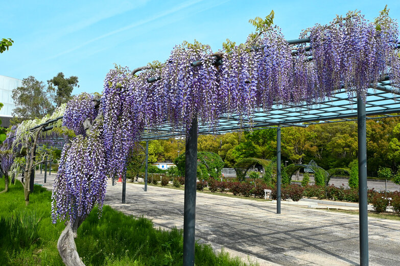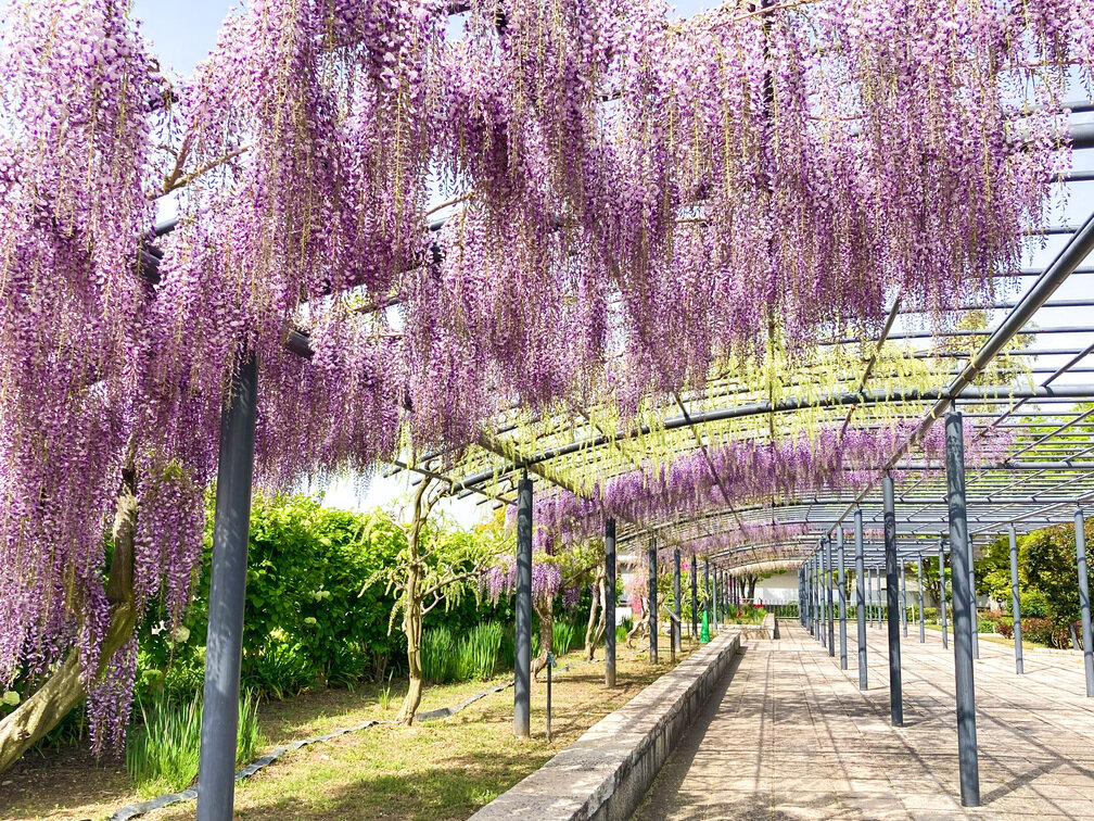 大阪「のだふじ」の意思を引き継ぎ2019年に新設された約80mにも及ぶ藤棚。