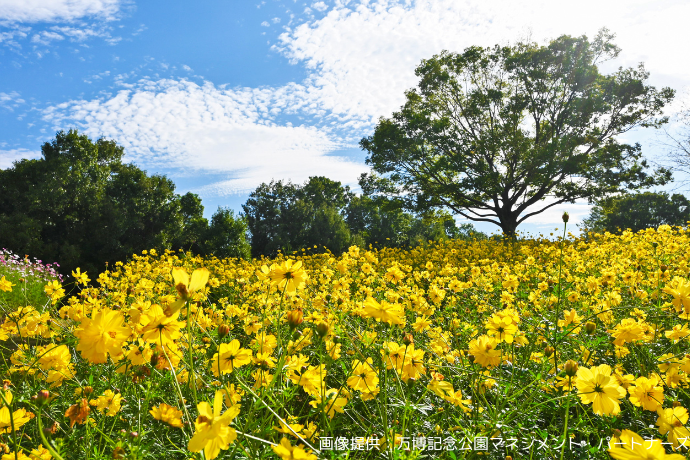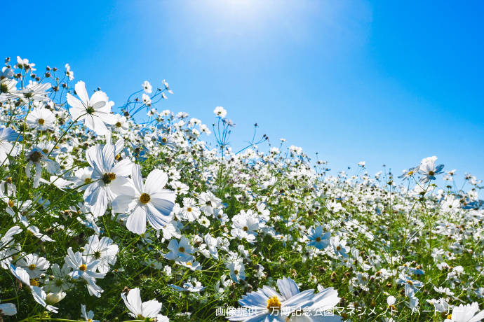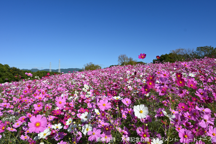 自然文化園にある「花の丘」では、例年10月上旬から下旬にかけて、人気品種のセンセーションミックスや、秋空に映える純白のセンセーションホワイト、鮮やかなキバナコスモスなど、約15万本のコスモスが咲き誇ります。