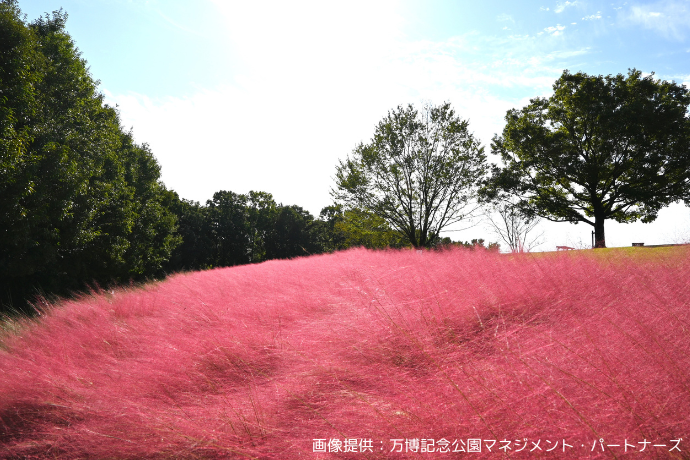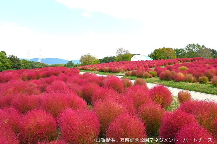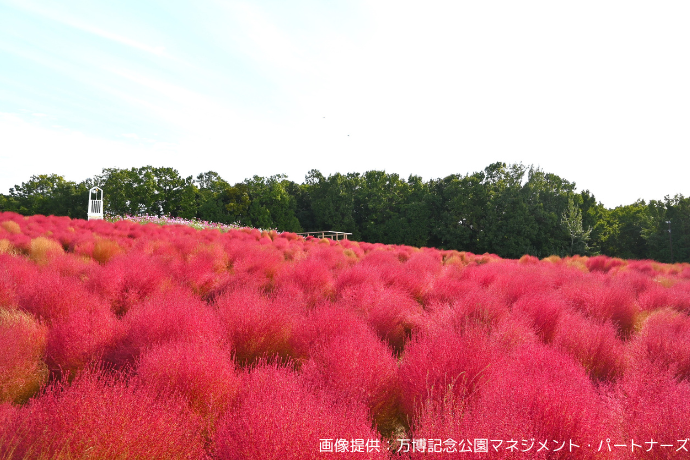 同じ時期に、真っ赤に紅葉し見ごろを迎える約3,600株のコキアも必見です。