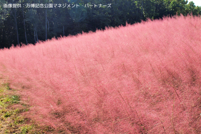 このほかにも、幻想的なピンクの穂が美しいミューレンベルギアなど、いろいろな秋の草花でカラフルに彩られる花の丘をお楽しみください。