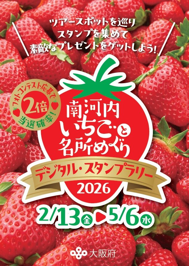 産地でこそ味わうことができる完熟いちごやスイーツ、南河内管内の観光名所等をめぐり、楽しみながらスタンプを集めて