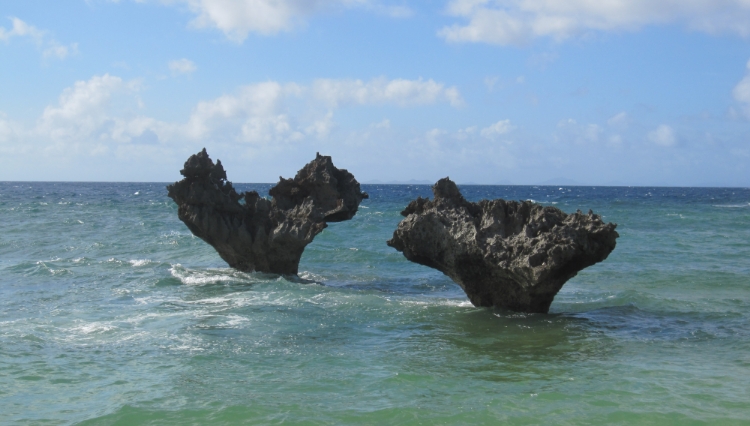 海に並ぶ変わった形をした岩と岩が重なり合う位置に立つと——、「ハートに見える!」のCMで有名な浜。「恋人たちの聖地」とも呼ばれる人気のパワースポットです。ひとつの岩だけでも小さなハートに見えたり、ふたつの岩の間の空間が逆さのハートに見えたりと、立ち位置や角度で色んなハートが登場。自然が作り出した奇跡のハートを探そう!