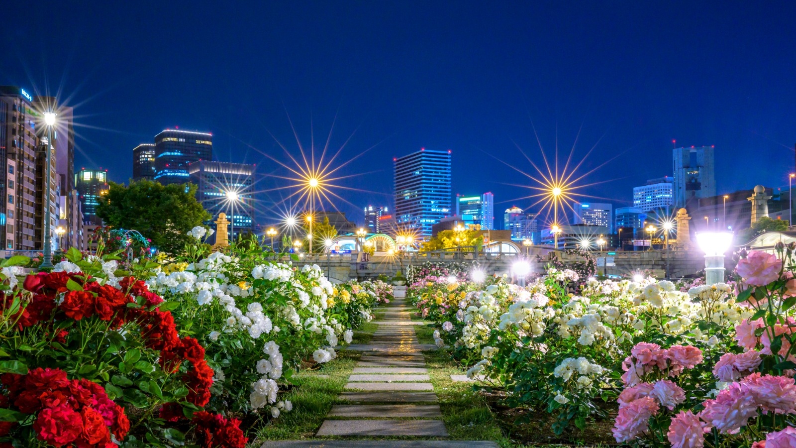 The Rose Garden lies just east of Naniwa-bashi Bridge. It is divided into two sections by a picturesque canal with an arched bridge and contains 3,700 rose bushes of 310 varieties.