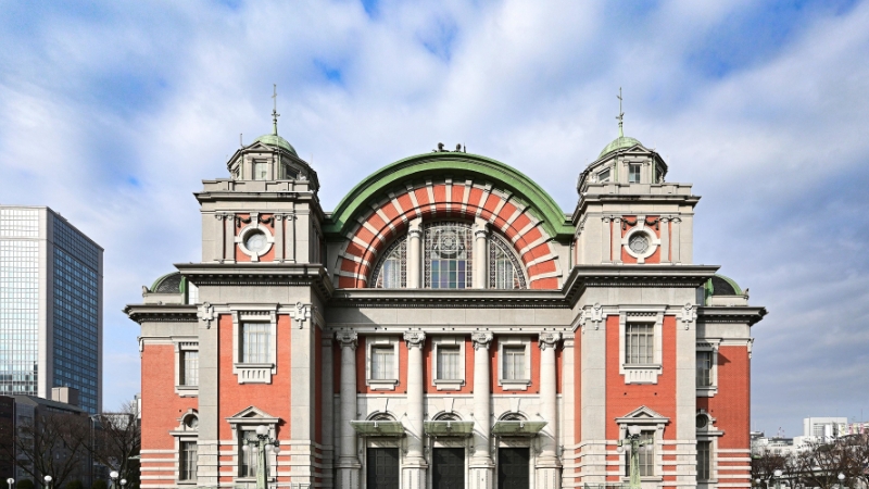 The Osaka City Central Public Hall is an enduring reminder of Osaka's pre-World War II heyday, known as the "Great Osaka" period. The hall is one of the city's best-known landmarks, with a red-and-white "neo-Renaissance" facade amid the verdant trees and sparkling waters of Nakanoshima, an island between the Dojima and Tosabori rivers. The building's original construction was funded by a private citizen, and it has played a prominent role in civic life for more than a century, even earning recognition as an Important Cultural Property after a turn-of-the-century restoration undertaken by popular demand.