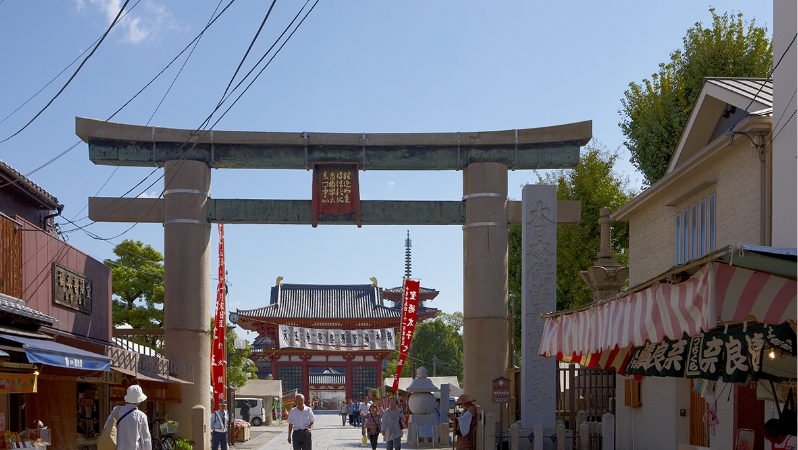 an Important Cultural Property erected by order of the emperor in 1294. In the thirteenth century, it was possible to stand at the West Gate and watch the sun set over Osaka Bay, a