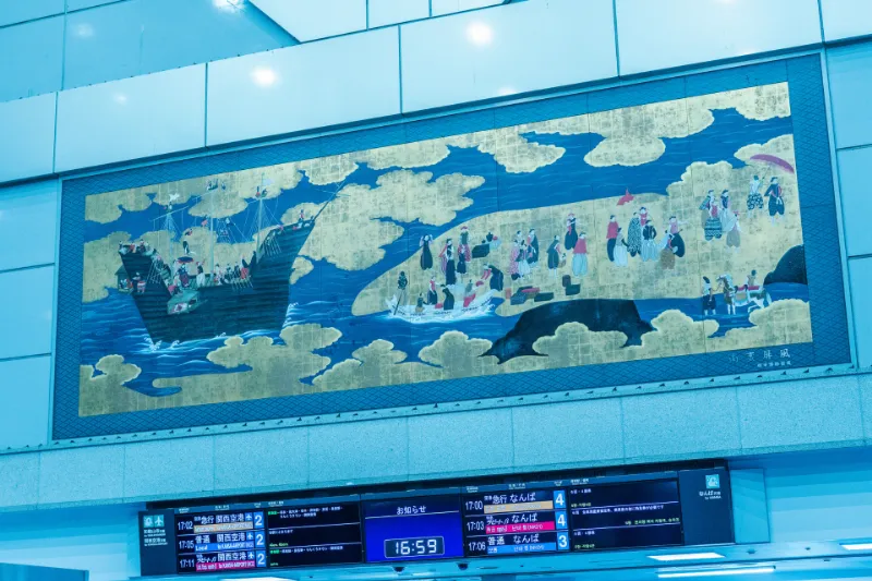 ガイドに促され、振り返るように改札を見上げると、黄金が散りばめられた巨大な絵が飾られていた。南蛮船と思われる船と、上陸して向かっていく人々、そして全体を囲うように輝く金色。まさにガイドの語る「黄金の国」という印象そのもの。