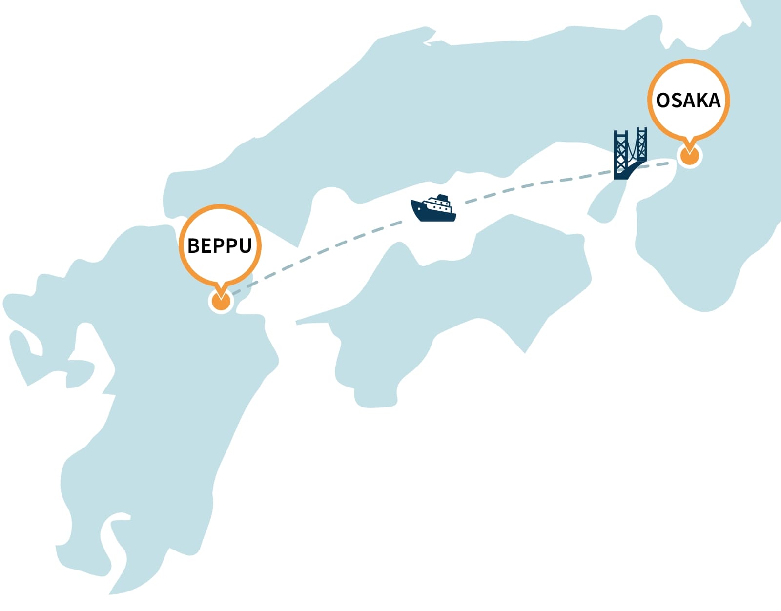ออกเดินทางจากท่าเรือโอซาก้าใต้ในเวลากลางคืน คุณสามารถพักผ่อนอย่างสบายๆ บนเรือพร้อมบุฟเฟ่ต์และห้องอาบน้ำรวมขนาดใหญ่ ก่อนจะถึงรีสอร์ทบ่อน้ำพุร้อนเบปปุในเช้าวันรุ่งขึ้น เมื่อไปถึงที่นั่น คุณสามารถเพลิดเพลินกับ "ทัวร์นรกเบปปุ" และอาหารท้องถิ่น ก่อนจะเดินทางกลับโอซาก้าด้วยเรือเฟอร์รี่เที่ยวเดียวกันในคืนนั้น ทำให้การเดินทางครั้งนี้เป็นการเดินทางด้วยเรือเฟอร์รี่แบบไม่ต้องพักค้างคืนเลย