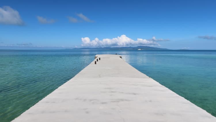 向藍色大海筆直延伸的白色棧橋。向西延伸,作為夕陽的名勝也很有名。雖然是很受歡迎的觀光景點,但因為是全長105m的長橋,所以可以一邊悠閒地走著或坐著一邊飽覽壯觀的景色。