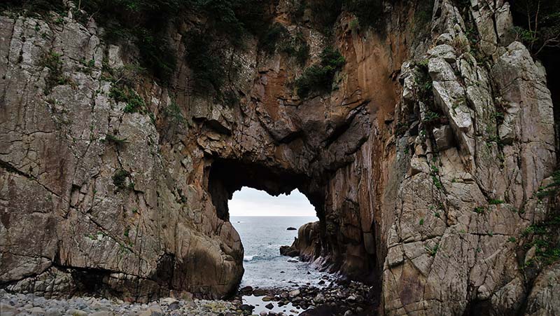 足摺岬先端にある花崗岩の洞門。高さ16m・幅17m・奥行き15mの大穴が神秘的な景観をつくりだし、県の天然記念物に指定。