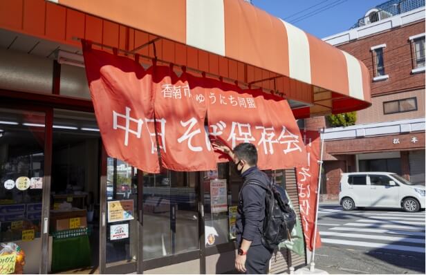 日用品や生鮮食品が並ぶ中、奥が食堂となっているユニークな店構え。うどんダシに中華麺が合わさった「中日そば」は必食!
