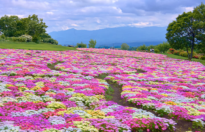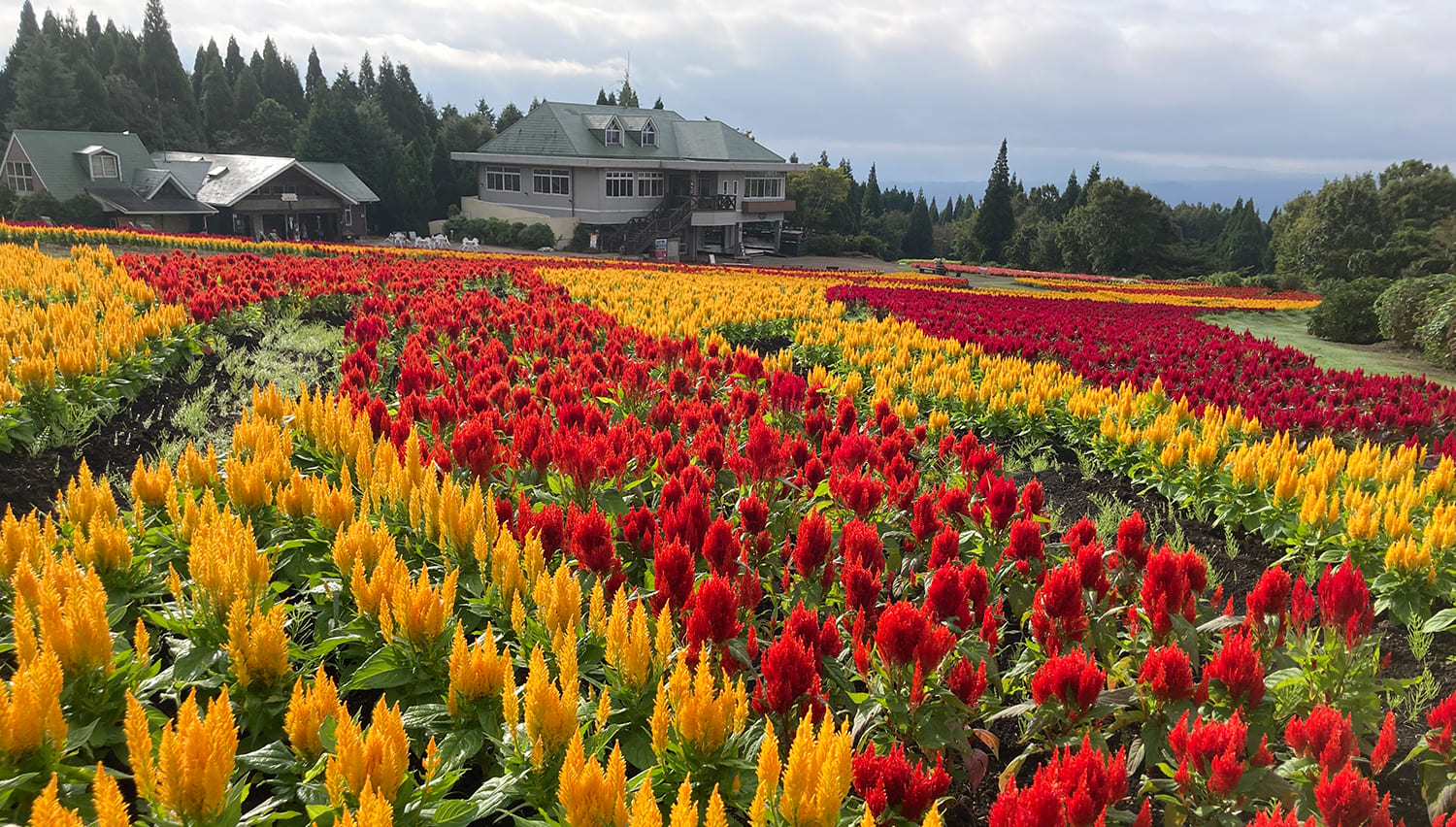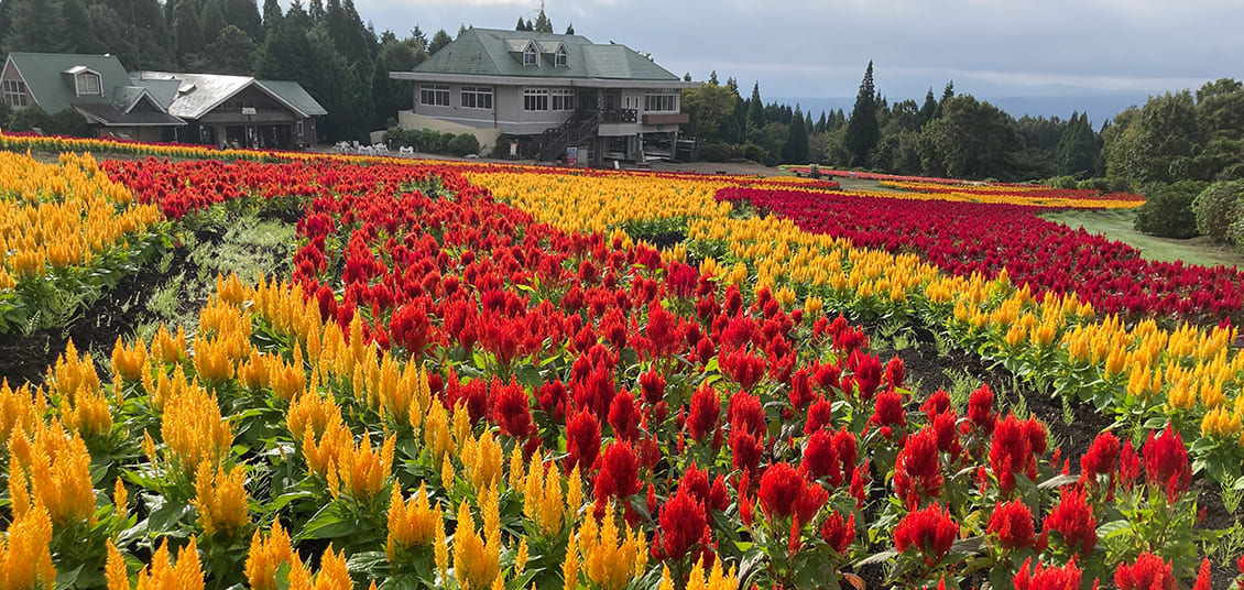 九州の久住高原に広がるくじゅう花公園は、春から秋にかけて多彩な花が咲き、エリアごとに異なる風景が楽しめます。
