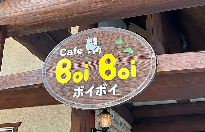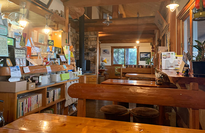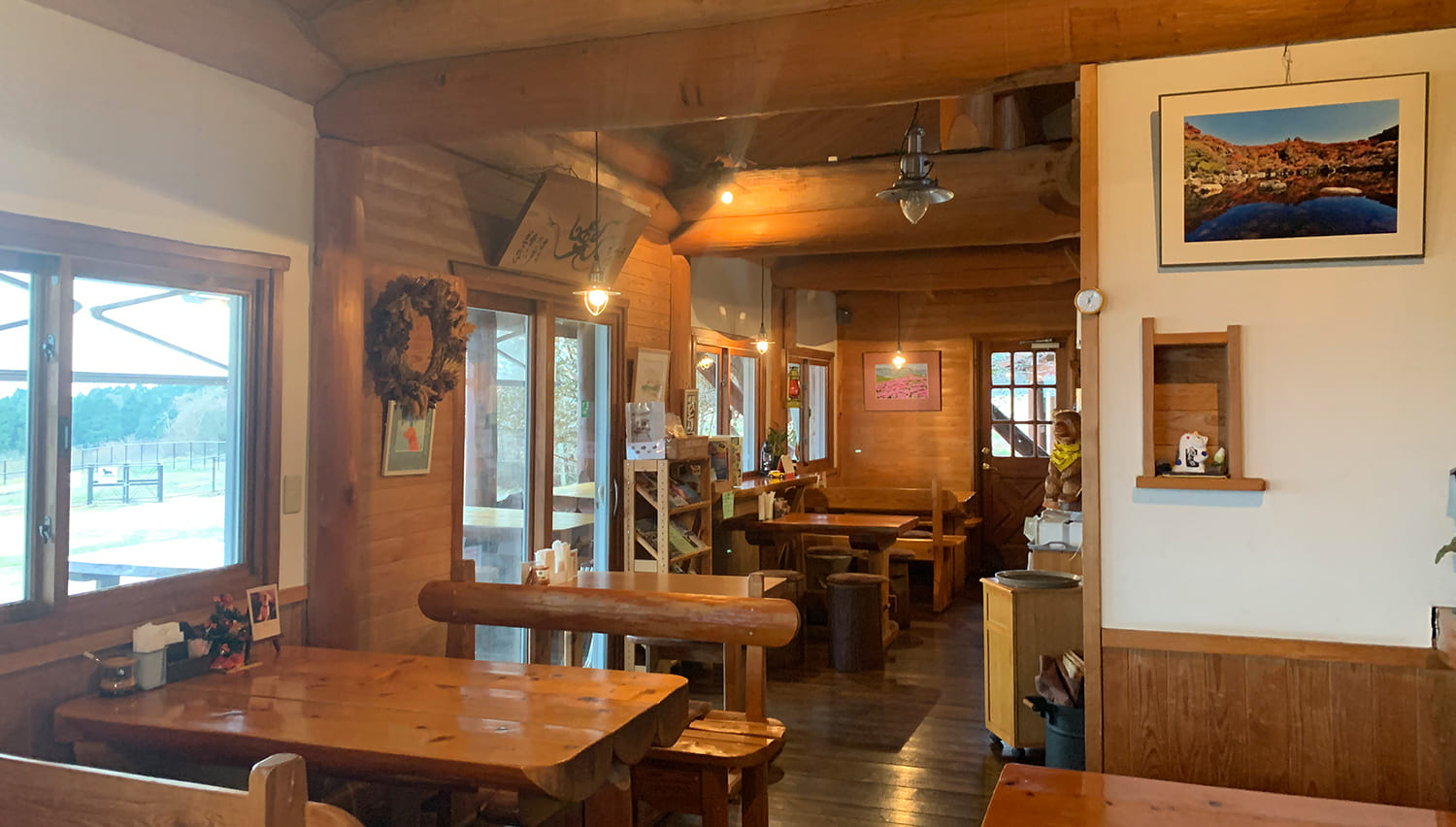 カフェはログハウス風の佇まいで、テラス席からは草原や山々の絶景を楽しめます。