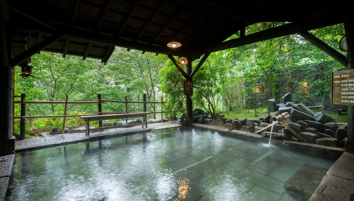 「滝観庵」からは滝を眺めながら温泉を楽しめ、館内には源泉かけ流しの5つの貸し切り露天風呂もあります。手作りにこだわった本格懐石料理が味わえます。